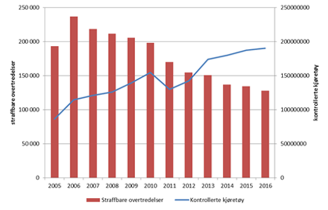 Antall straffbare overtredelser i Automatisk trafikkontroll (ATK) (inkludert streknings-ATK) har sunket kraftig fra 2005 til 2016, til tross for at det i samme periode har blitt kontrollert over 100 millioner flere kjøretøy og den totale driftstiden for fotoboksene er mer enn doblet.